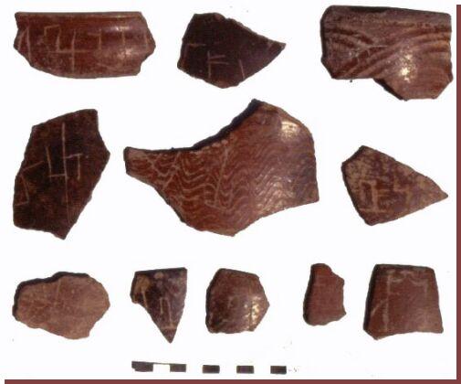 Several pieces of broken pots are under display.