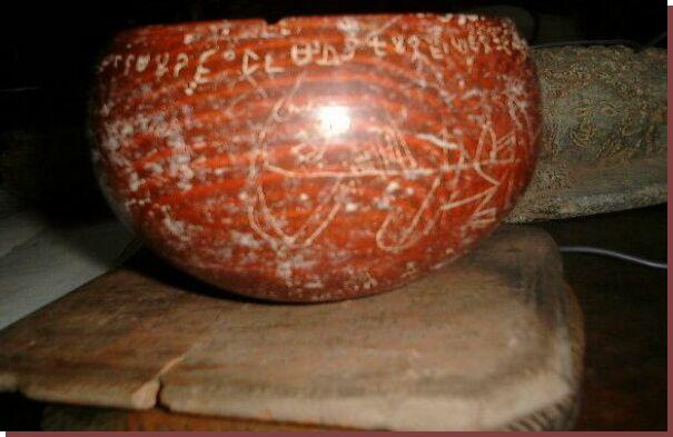 A clay pot over a clay tablet and a mouse like stone statue belonging to the same period. The inscription that is common in all these artifacts were written on the surface of the pot both before and after processing (heating).